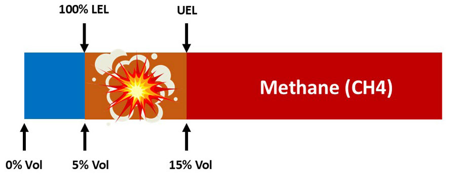 ในระบบตรวจจับก๊าซ ปริมาณก๊าซที่ปรากฏจะระบุเป็นเปอร์เซ็นต์ (%) ของ LEL เพื่อลดความเสี่ยงที่เกี่ยวข้องกับก๊าซที่ติดไฟได้ จำเป็นต้องเข้าใจช่วงการระเบิดซึ่งอยู่ระหว่าง Lower Explosive Limit (LEL) และ Upper Explosive Limit (UEL):