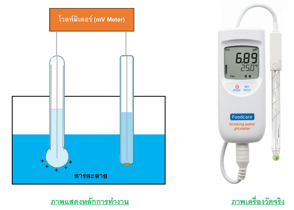 • หลักการของเครื่องวัดค่า pH = วัดความแตกต่างของแรงดันไฟฟ้าที่เกิดจากความเข้มข้นของไอออน H⁺