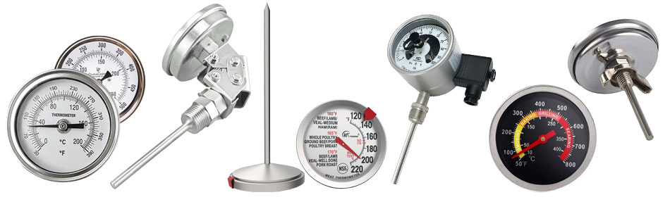 อุปกรณ์เหล่านี้ใช้โลหะสองชนิดที่เชื่อมติดกันซึ่งขยายตัวในอัตราที่แตกต่างกันเมื่อได้รับความร้อน ความแตกต่างในการขยายตัวทำให้แถบโค้งงอ ซึ่งทำให้เข็มเคลื่อนไปตามมาตราส่วน